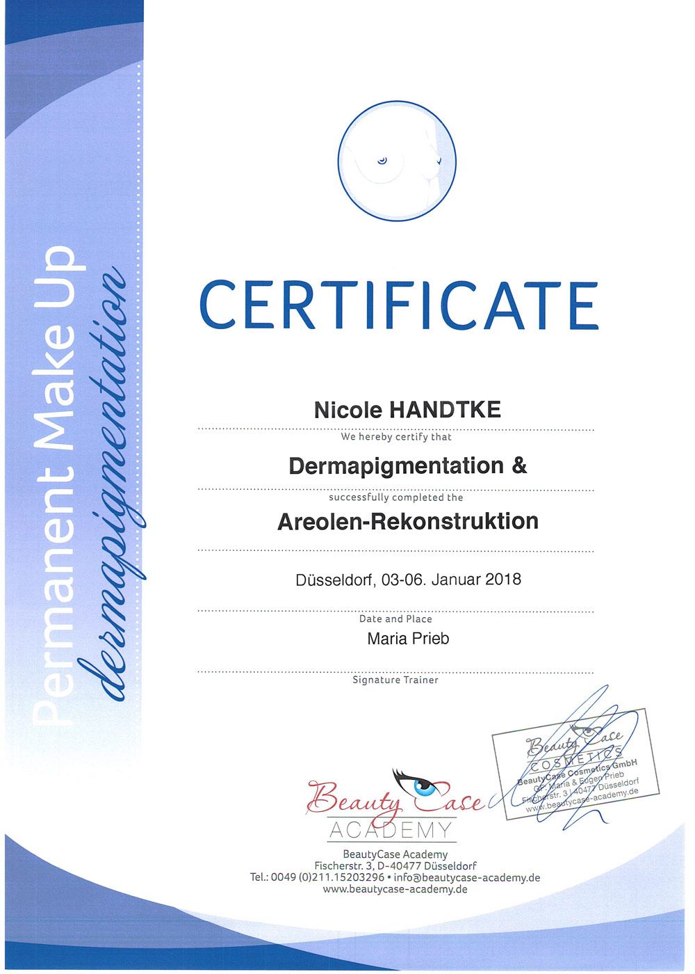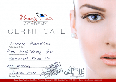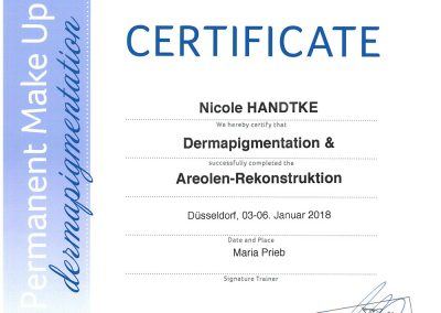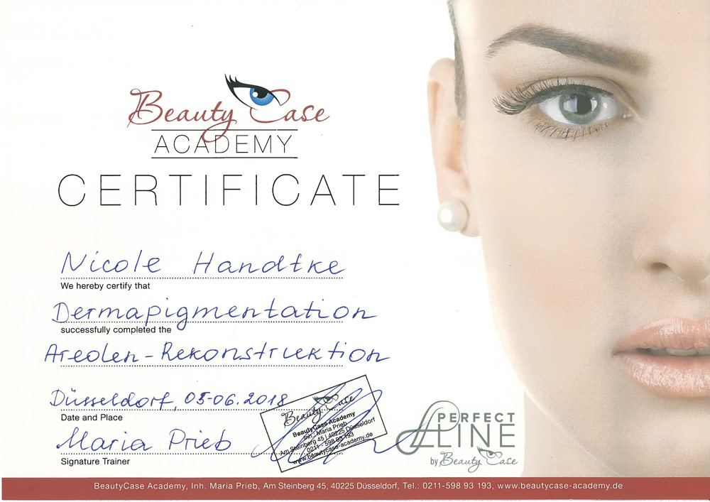 Frau Handtke ist zertifizierte PerfectLine Pigmentistin und arbeitet im Netzwerk mit verschiedenen Experten aus der Medizin und weiteren Institutionen zusammen.