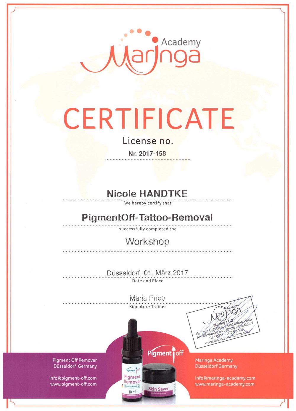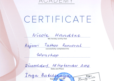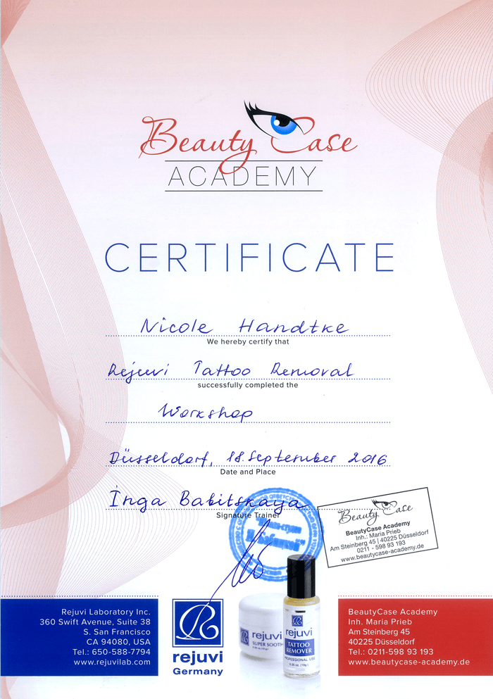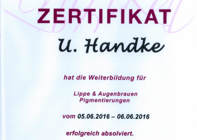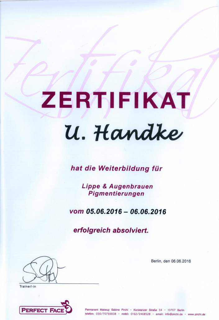 Auf der Suche nach neuen Herausforderungen hat sie im Laufe der Berufsbahn mehrere Ausbildungen im Bereich Permanent Make Up und dessen Entfernung mit Remover-Methoden erlernt. Frau Handtke legt sehr viel Wert auf individuelle, kundenbezogene Arbeit, auf Präzision, Sauberkeit und Hygiene. Sie ist eine leidenschaftliche PMU-Artistin und Blessed Beauty Trainerin.